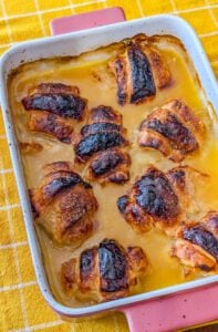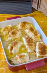 - Bake uncovered for 35–45 minutes, or until the dumplings are golden brown and the sauce is bubbling.