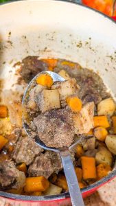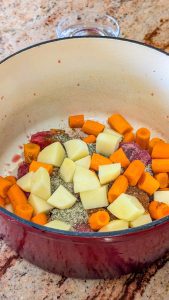 - Add the carrots, potatoes, and onion to the pot, stirring briefly to coat them in the remaining oil and pan drippings.