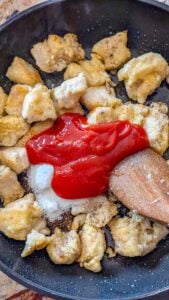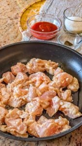 - Pour the sweet and sour sauce evenly over the chicken in the pan.