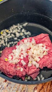 1. In a large saucepan or pot over medium-high heat, cook the ground beef and diced onions together until the beef is browned and the onions are softened. Drain any excess grease.