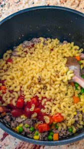 3. Add the uncooked macaroni and frozen mixed vegetables to the pot. Reduce the heat to medium-low, cover, and simmer until the macaroni is tender and cooked through, about 10–12 minutes.