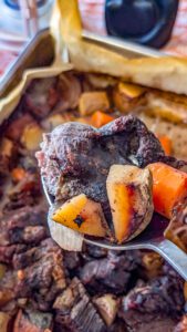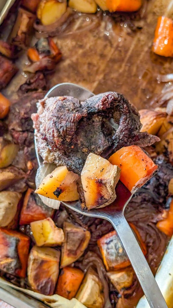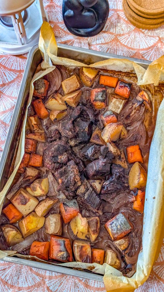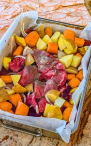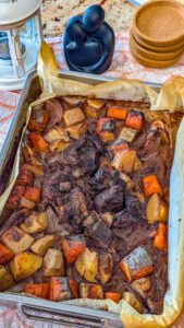 9. Bake in the preheated oven for approximately 3 hours, or until the beef is tender and the vegetables are cooked through.