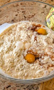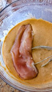 - Remove the chicken from the flour mixture and dip each piece into the egg mixture, coating completely. Return the chicken to the zip-top bag and shake again to create a second, thicker coating.