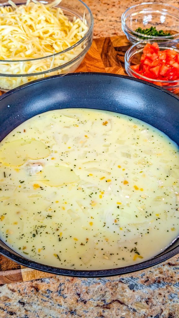 - Turn the heat down and add the milk and shredded cheese.