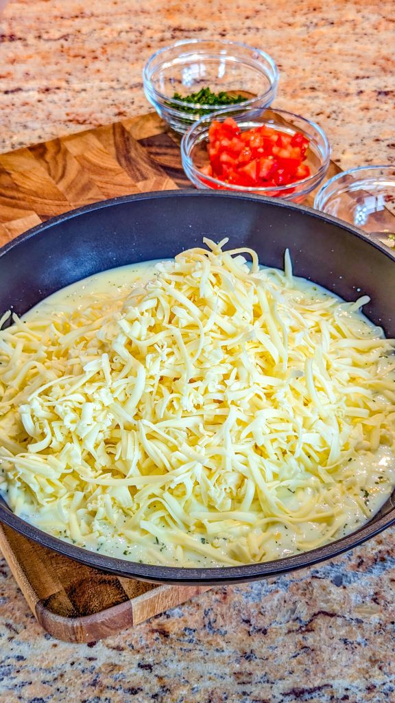 Turn the heat down and add the milk and shredded cheese.