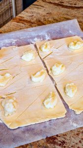 - Starting at the wide end, carefully roll each triangle toward the point, tucking in the sides as needed to keep the filling inside.
