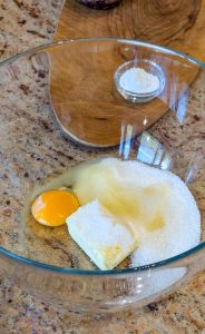 - In a large bowl, whisk together the beaten egg and sugar until well combined. Add the milk and melted butter, and mix again.