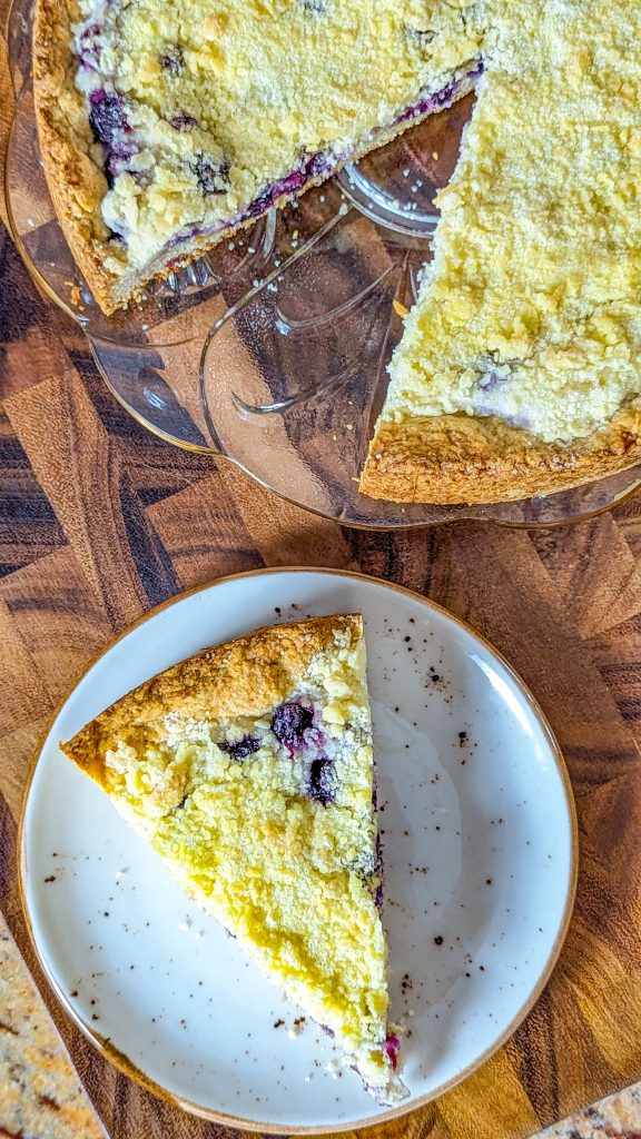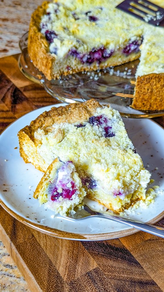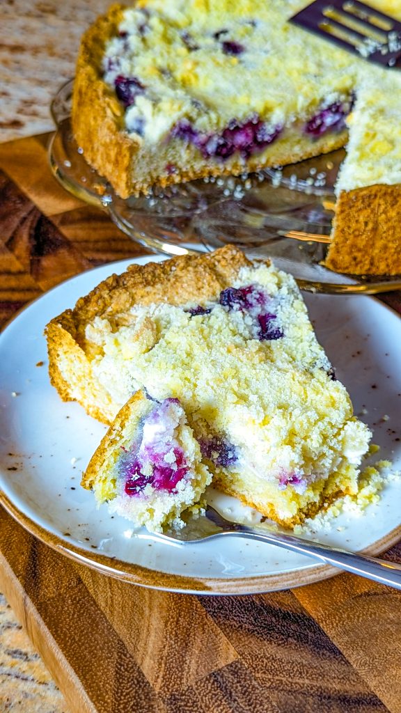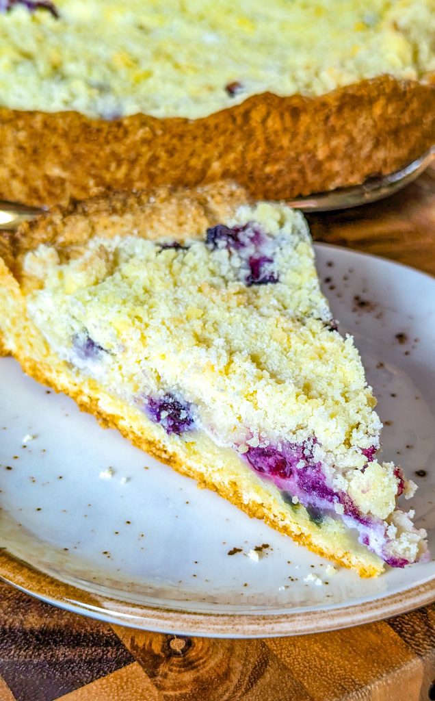 This wonderful coffee cake has some incredible flavors. You are going to love the tender crumb crust, the soft cream cheese layer and of course those tangy and sweet juicy blueberries. The streusel topping finishes the whole thing off beautifully with a nice crunch.