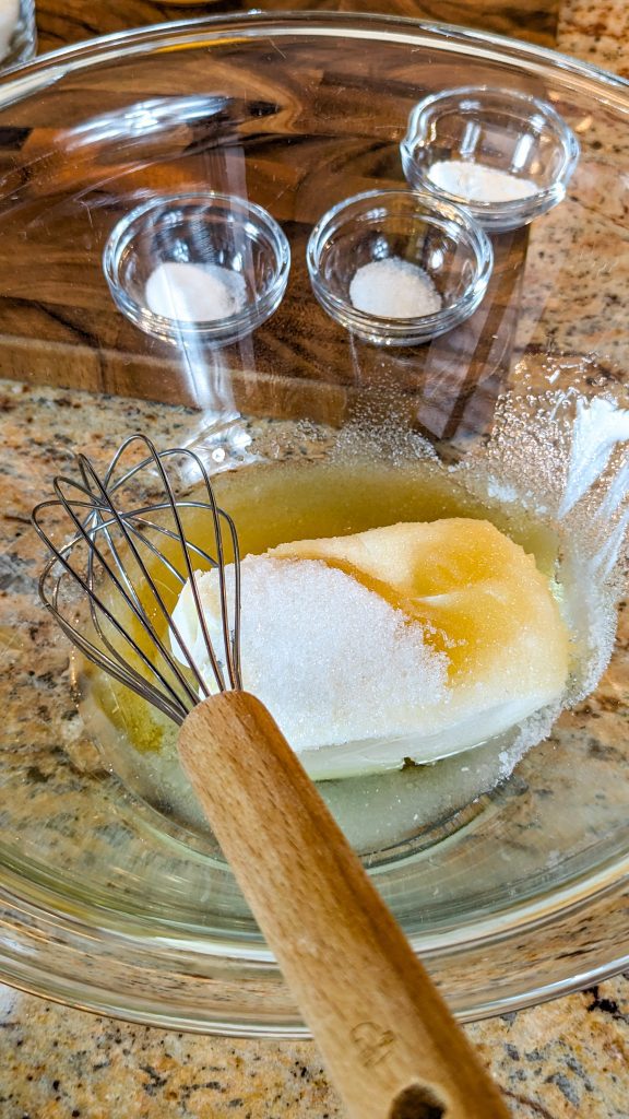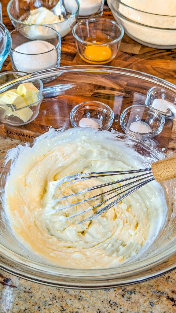 - For the cake base, sift the flour with the baking soda, baking powder, and salt into one bowl and cream the butter and sugar in another bowl before adding the whole egg plus egg yolk and vanilla extract.