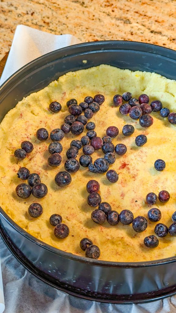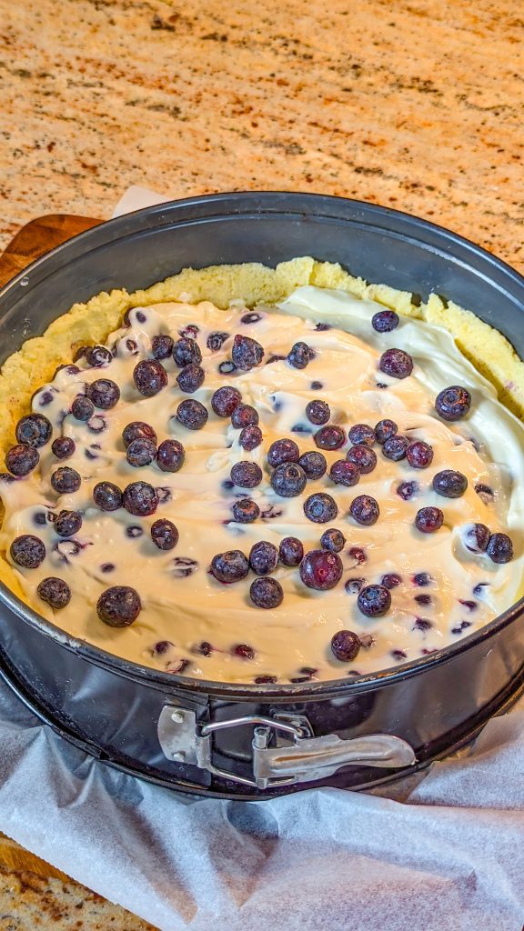 - Add about ⅓ of the blueberries on top of that and then add the cream cheese mixture. Scatter the rest of the blueberries on top of that.