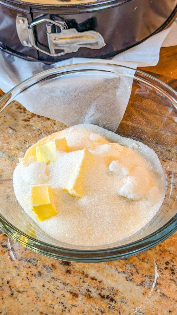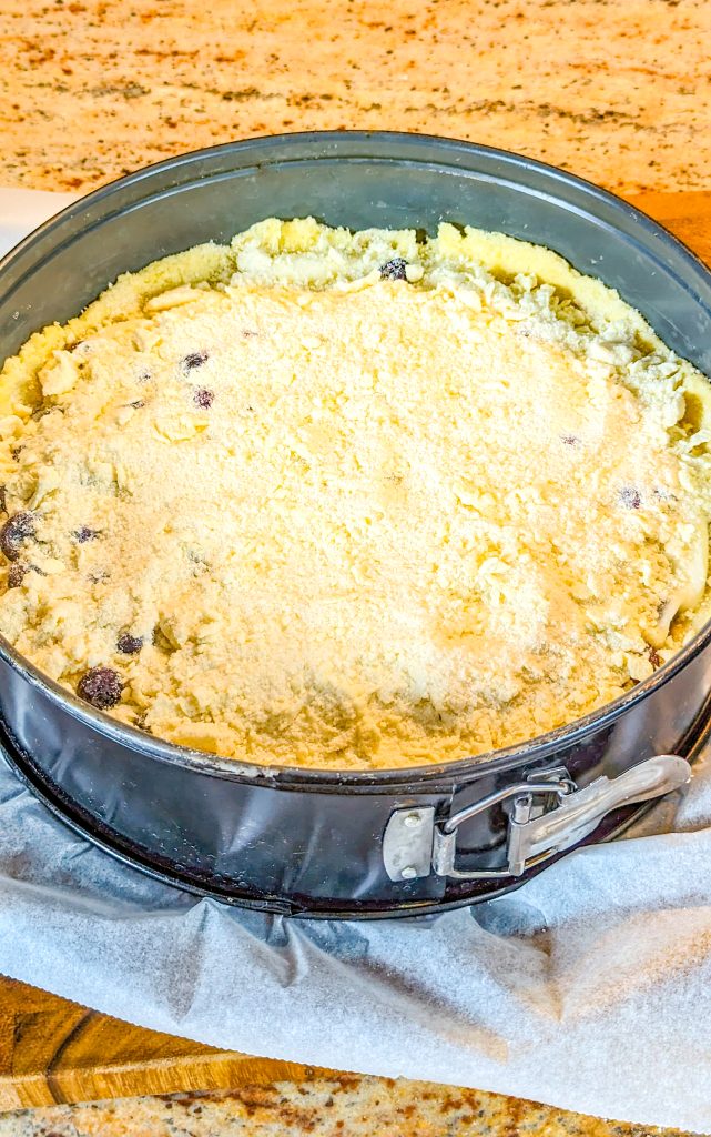 - Next, make the streusel topping. Mix the flour, sugar and butter using a pastry blender or fork until you have a crumbly consistency and pea-sized crumbs.