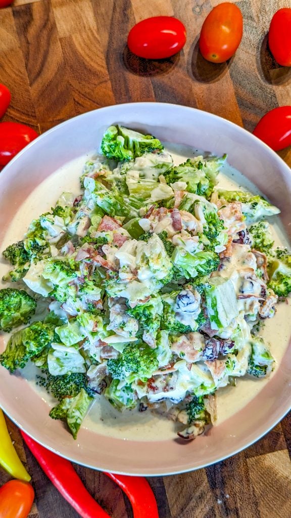 It’s quick and easy to make, especially if you’re starting off with cooked bacon. That way, you just have to assemble the broccoli salad. If you do prefer more tender, rather than raw, broccoli, you can blanch it in boiling water for a minute or two, then rinse under cold running water.
