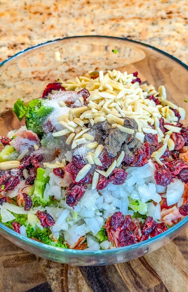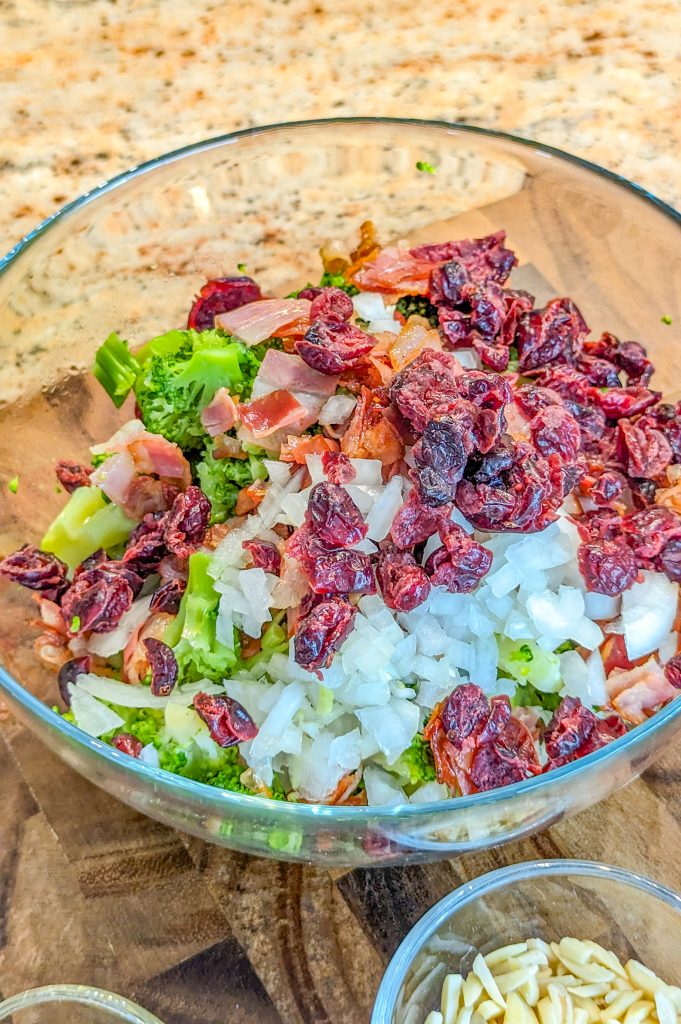 - Toss the broccoli with the cranberries, bacon, onions, and almonds in a large bowl.