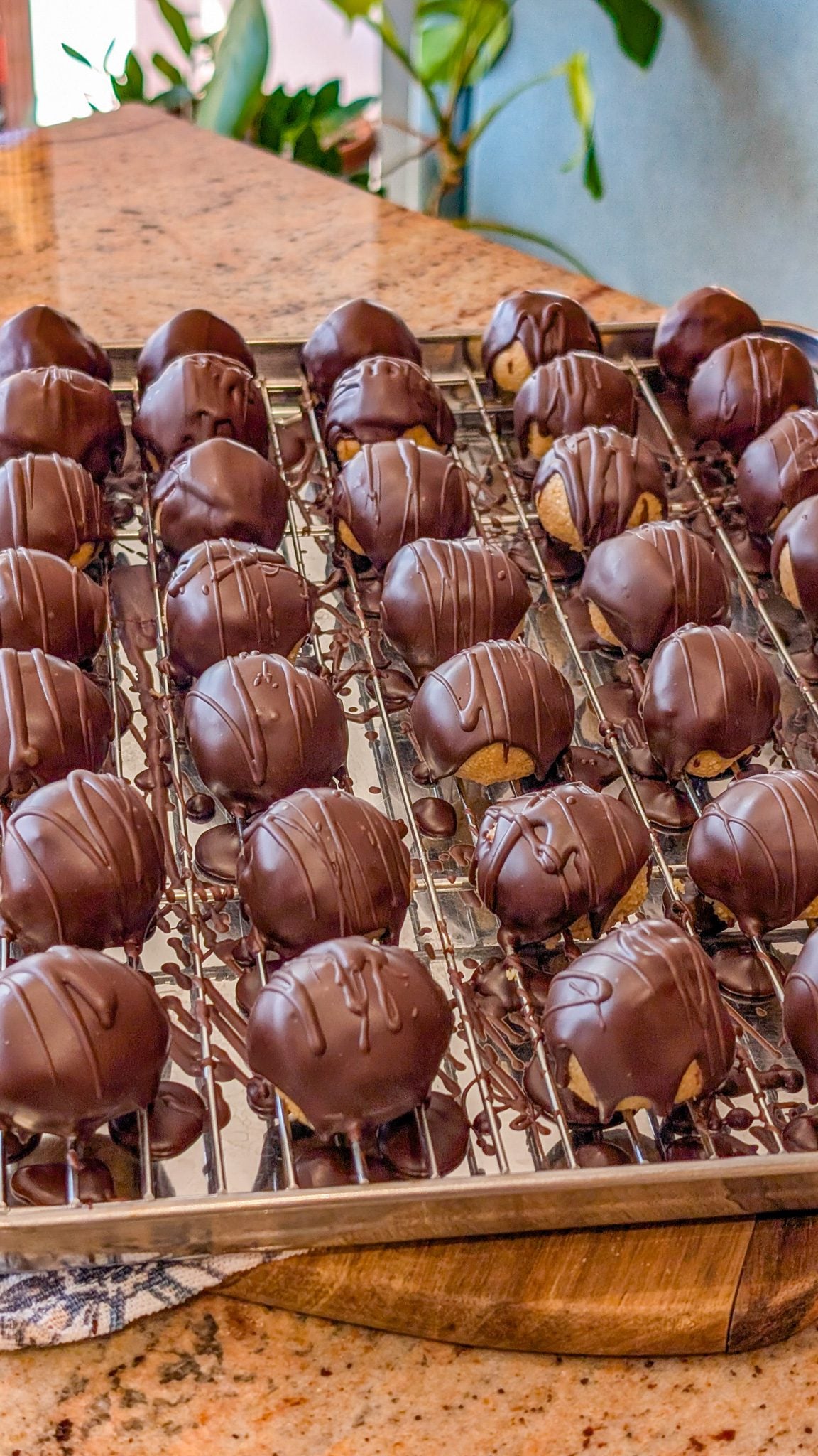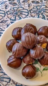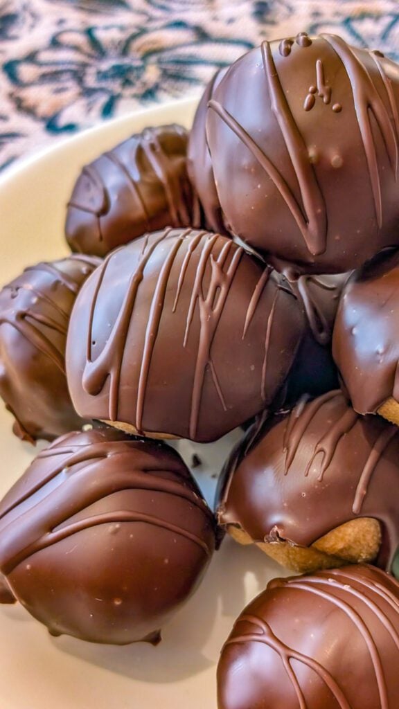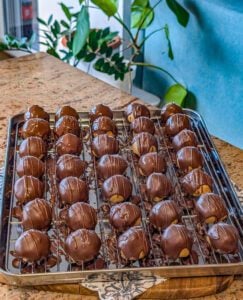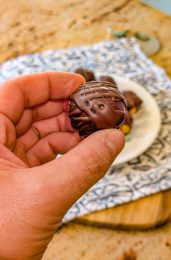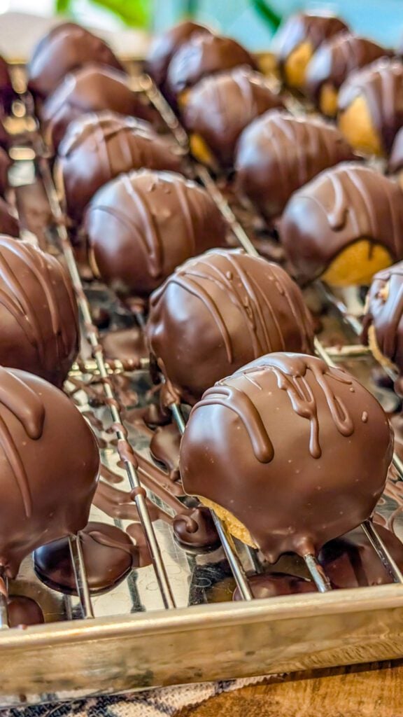 - Dip each ball completely into the melted chocolate, allowing excess to drip off.