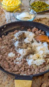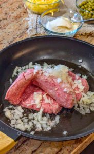 1. In a large skillet over medium-high heat, sauté the ground beef and diced onions until the beef is browned and the onions are softened.