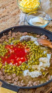 1. Add the tomato sauce, cooked rice, frozen peas, chicken broth, and 1 cup of shredded cheddar cheese to the skillet. Stir to combine and let the mixture simmer until the cheese is melted and everything is well incorporated.