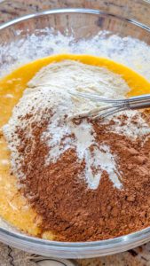 1. In a mixing bowl, combine the melted butter, flour, sugar, eggs, cocoa powder, baking powder, and vanilla extract. Beat until smooth and creamy. Spread the mixture evenly into the prepared baking dish.