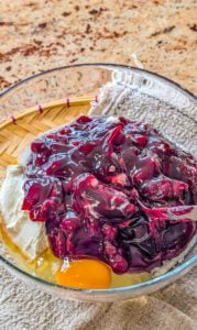 1. In a separate bowl, combine the softened cream cheese, ⅓ cup sugar, and 1 egg. Stir in the drained cherries from the pie filling. Mix until smooth and fully incorporated.
