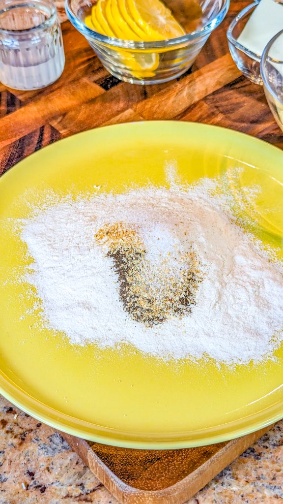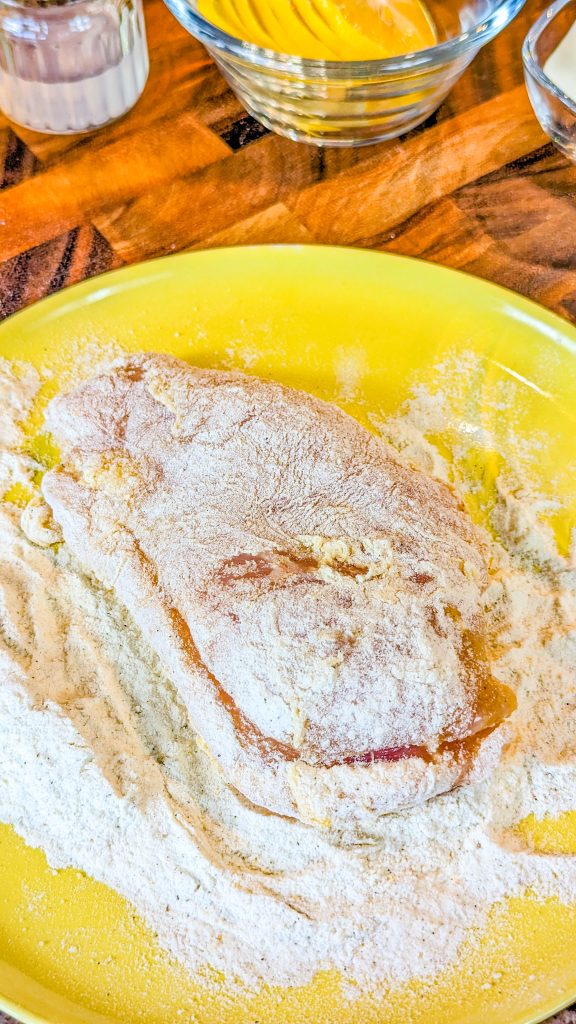 4. Dredge the chicken pieces in the flour first and then the eggs, letting the excess drip off.