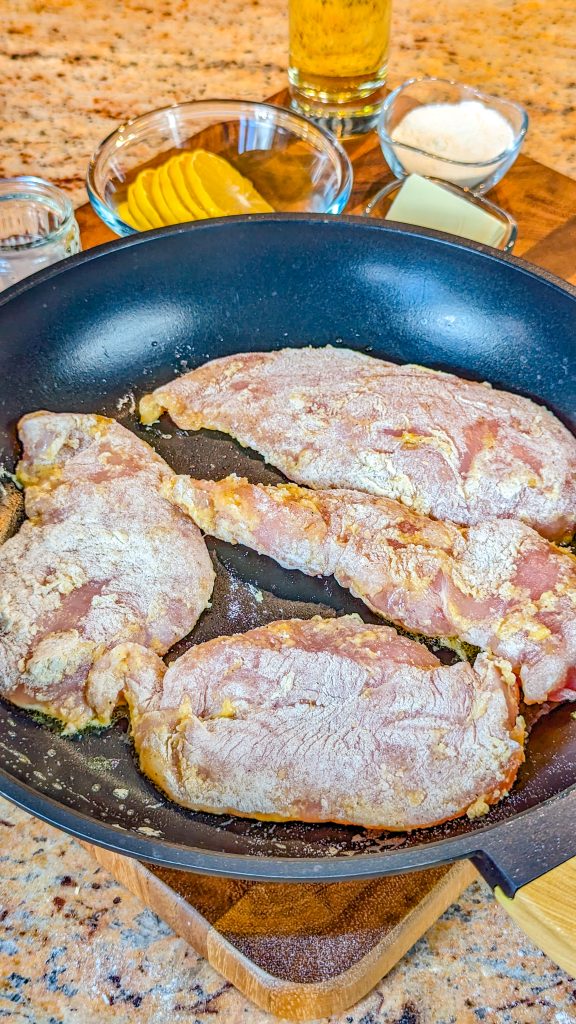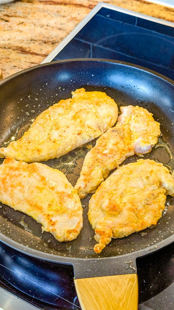 5. Now add the chicken to the skillet and cook until golden on the bottom.