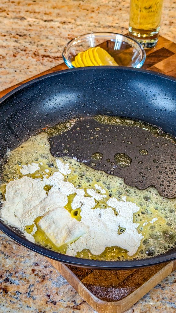 9. Whisk in the flour, cooking for 2 minutes, scraping any stuck-on bits up from the pan bottom using a wooden spoon.
