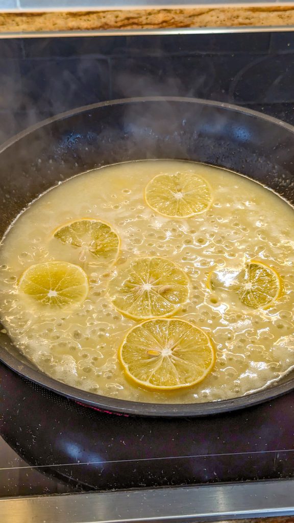 8. Turn the heat down and add the butter to the pan, stirring until dissolved.