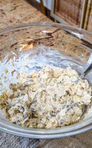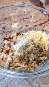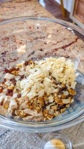 - In a large mixing bowl, add the shredded chicken, dried cranberries, chopped pecans, and sliced almonds.