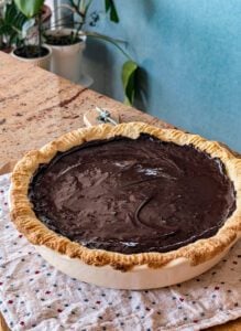 - Pour the chocolate filling into the prepared pie crust, spreading it evenly.