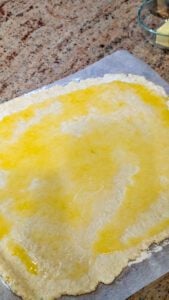 - Using a brush or spoon, spread the melted butter evenly over the surface of the dough.