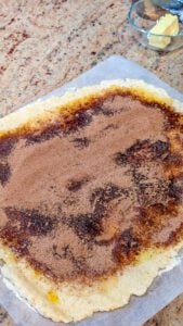 - Sprinkle this mixture evenly over the buttered dough, making sure to cover the entire surface.