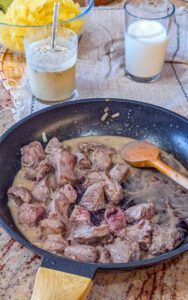 - Add the cubed sirloin and chopped onion. Sear until the beef is browned on all sides and the onions are soft, about 5–7 minutes.