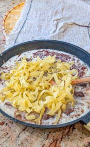 - Once the beef is tender, stir the cooked egg noodles into the beef and creamy sauce mixture until everything is evenly combined.
