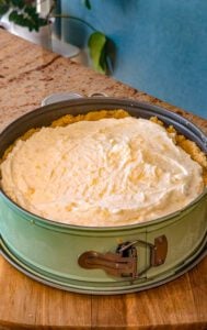 - Spoon the cheesecake filling into the prepared graham cracker crust. Spread it out evenly using a spatula, smoothing the top.