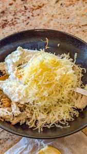 - In a medium mixing bowl, combine the shredded chicken, cream cheese, cheddar cheese, chopped green onions, garlic powder, onion powder, salt, and pepper. Stir until everything is evenly mixed and creamy.
