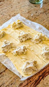 - Spoon a generous tablespoon of the chicken mixture onto the wide end of each crescent triangle. Starting at the wide end, roll the dough up toward the point, tucking in the filling as you go. Place each roll seam-side down on the prepared baking sheet.