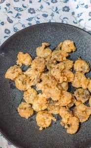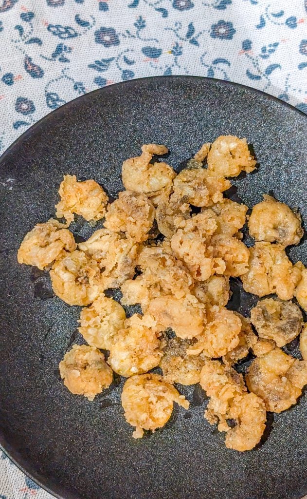 1. Carefully add the shrimp in batches to avoid overcrowding. Fry for 3–5 minutes per batch, turning occasionally, until the shrimp are golden brown and crispy.