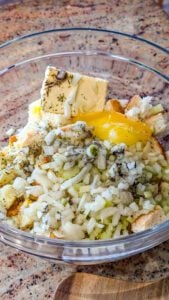 - In a large mixing bowl, combine the toasted low-carb bread and the cornbread stuffing. Mix them together until evenly blended.