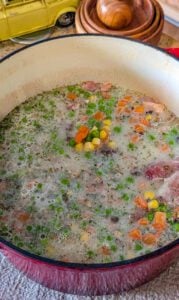- With 1 hour left, add the defrosted mixed vegetables to the crockpot. Stir to combine and shred the chicken slightly as you mix.
