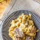 - 30 minutes before serving, stir the cooked pasta and frozen peas into the crockpot. Cover and let sit for the remaining cooking time so the flavors combine.