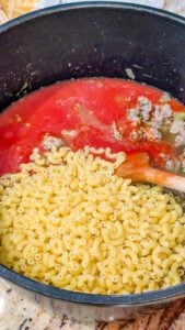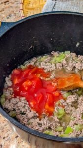 - Add the Italian seasoning, salt, pepper, tomato sauce, diced tomatoes, and beef broth. Stir everything together until well combined.