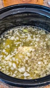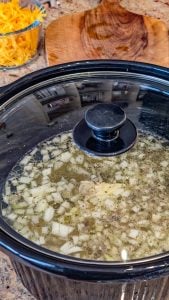- Place the peeled and cubed potatoes, chopped onion, minced garlic, butter, and rendered bacon fat into the crockpot.