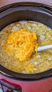 - Add the softened cream cheese and shredded cheddar cheese to the crockpot. Stir well until the cheeses are melted and fully incorporated, creating a creamy texture.