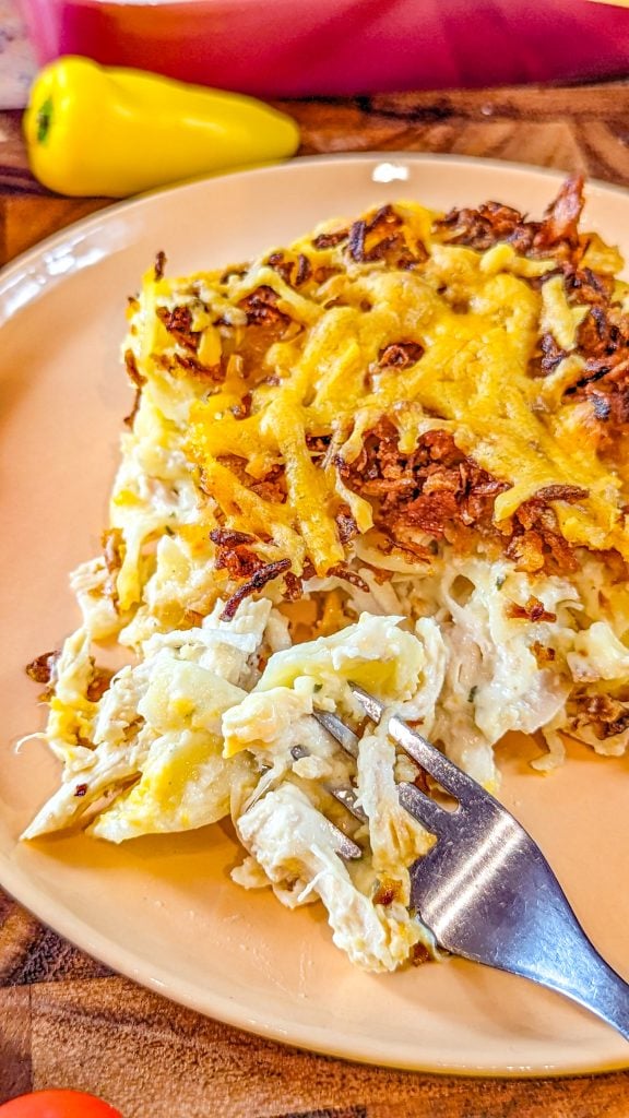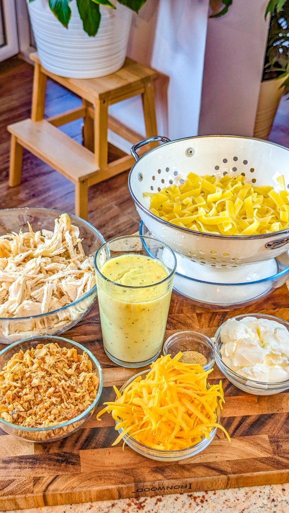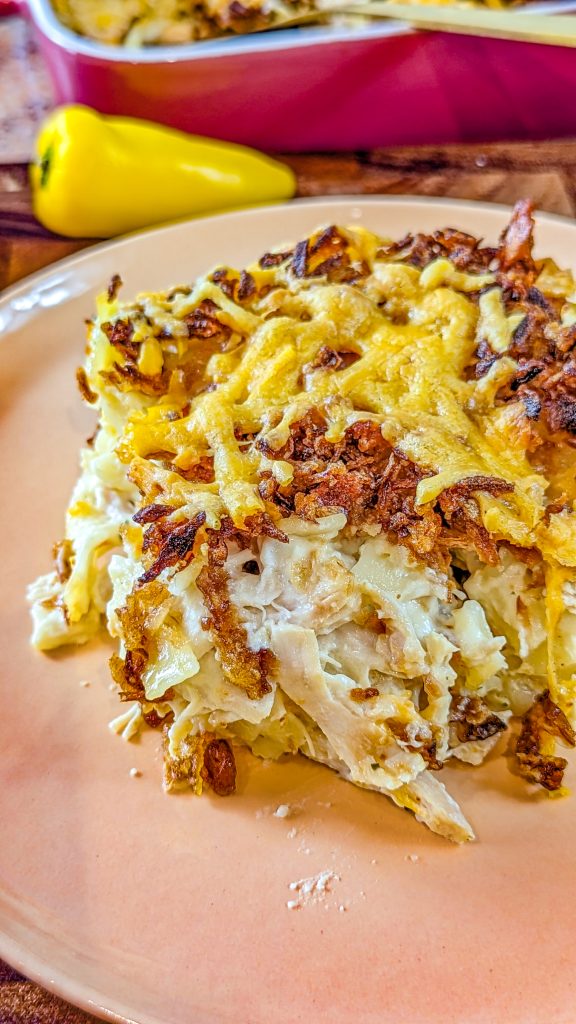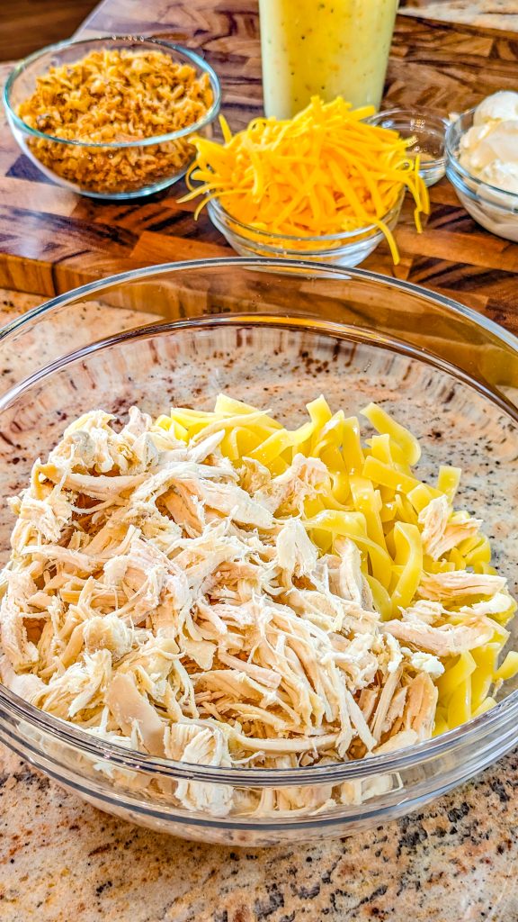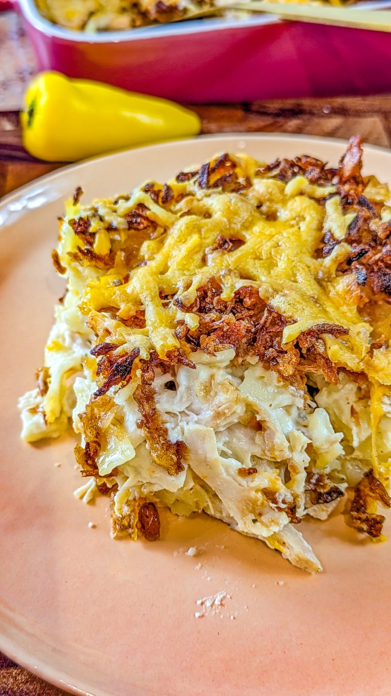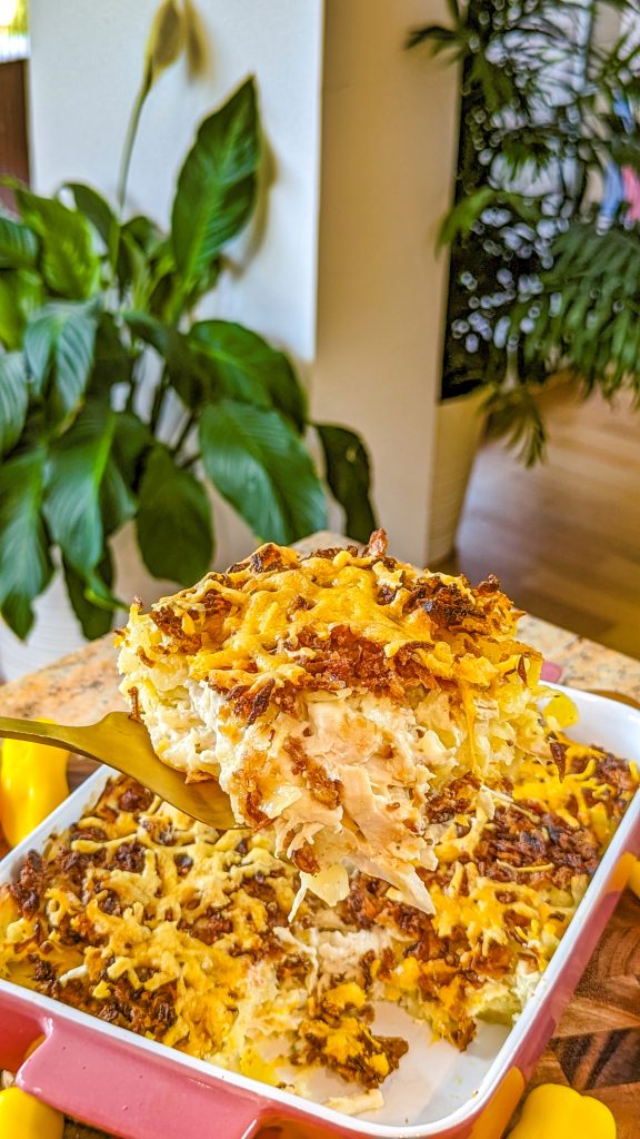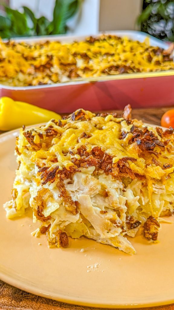 The crunchy chicken casserole is one of those dishes that you can prepare ahead of time and eat right before serving. I like to prepare my chicken ahead of time and have it in the fridge. But you can also get some rotisserie chicken from your local grocery store and shred it to pieces. Yes, it is that easy. Then, you have to lay the ingredients and let the oven do the rest. French fried onions are one of the secret ingredients for deliciousness. Yes, they infuse this casserole with tons of flavor.