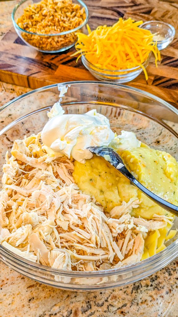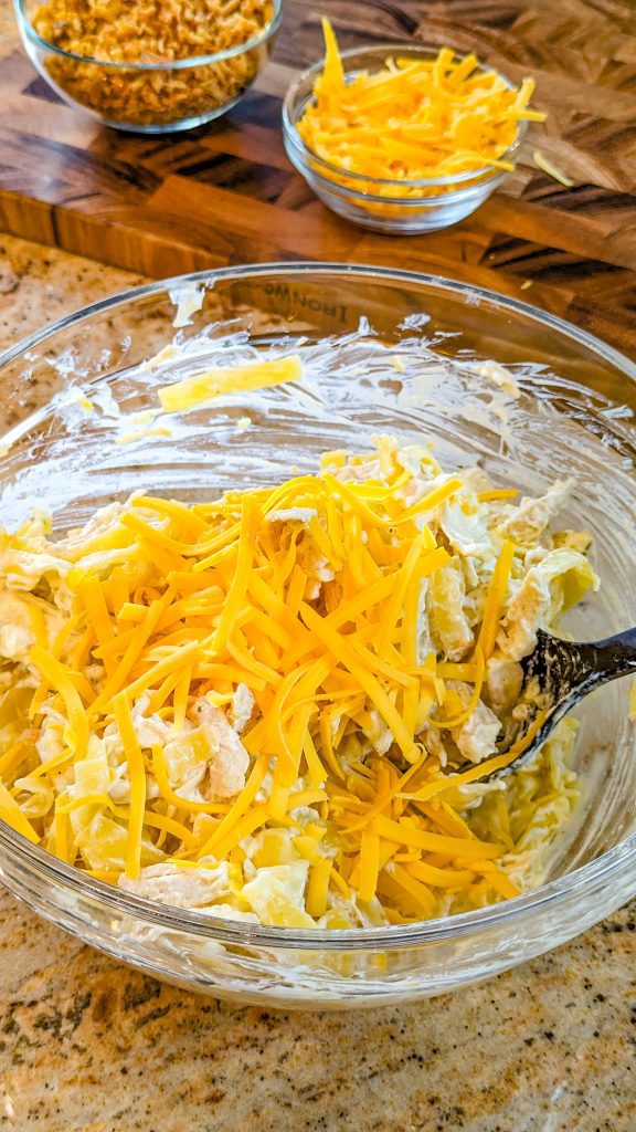 3. Add sour cream, shredded chicken, soup, half cheese, and garlic powder. Mix well until combined.