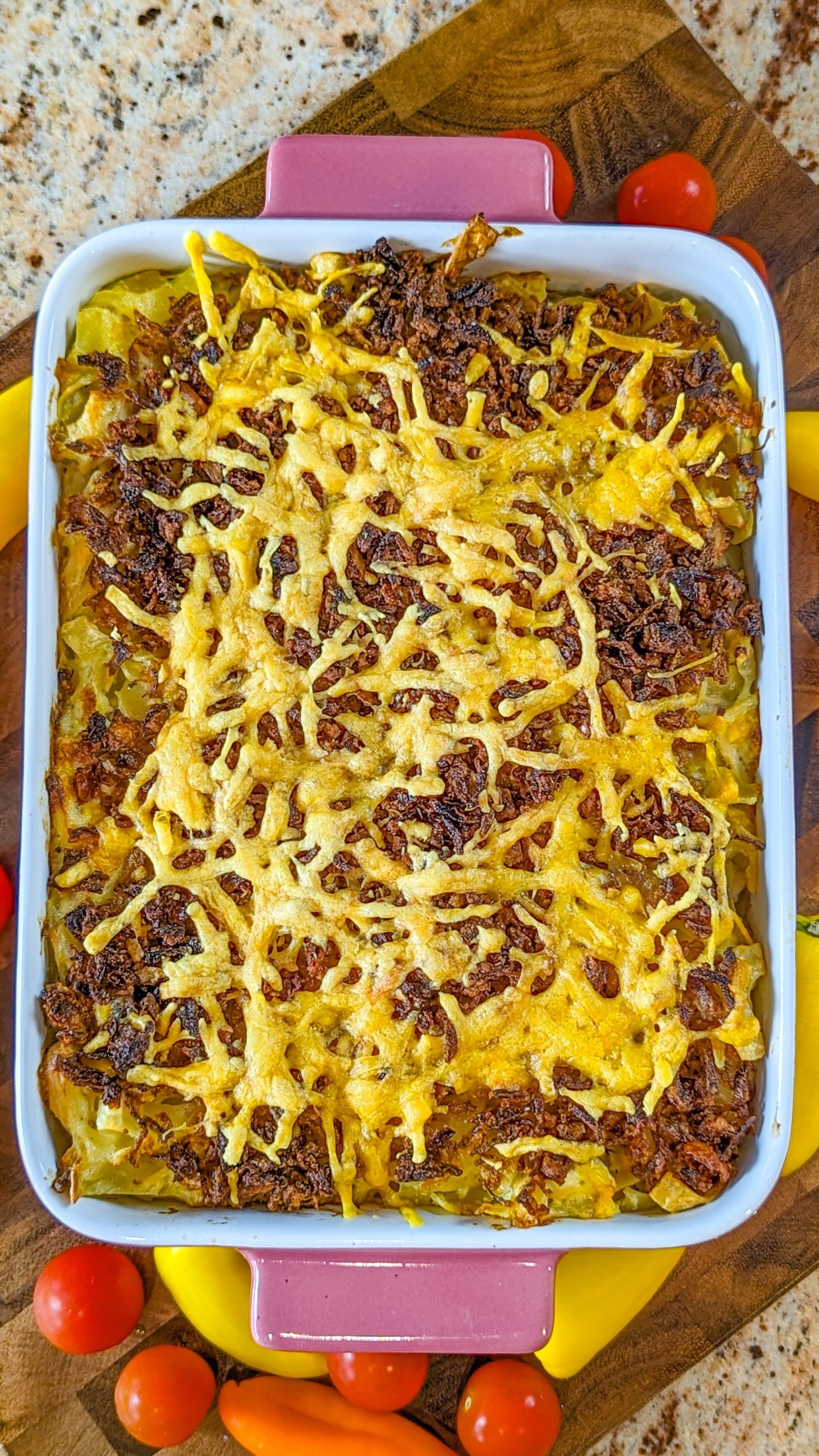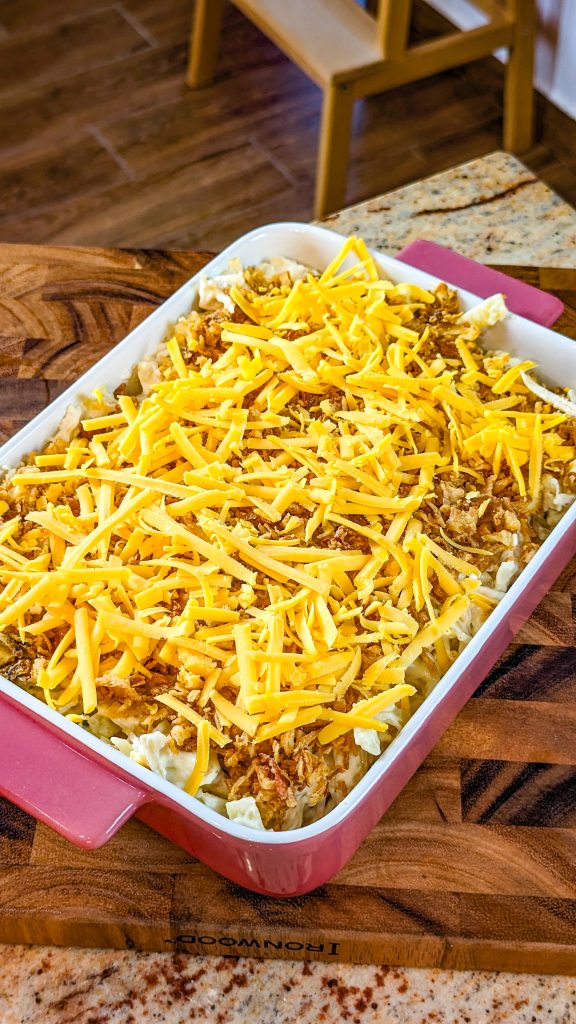 5. Remove from the oven and add remaining cheese and french-fried onions.