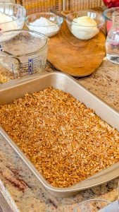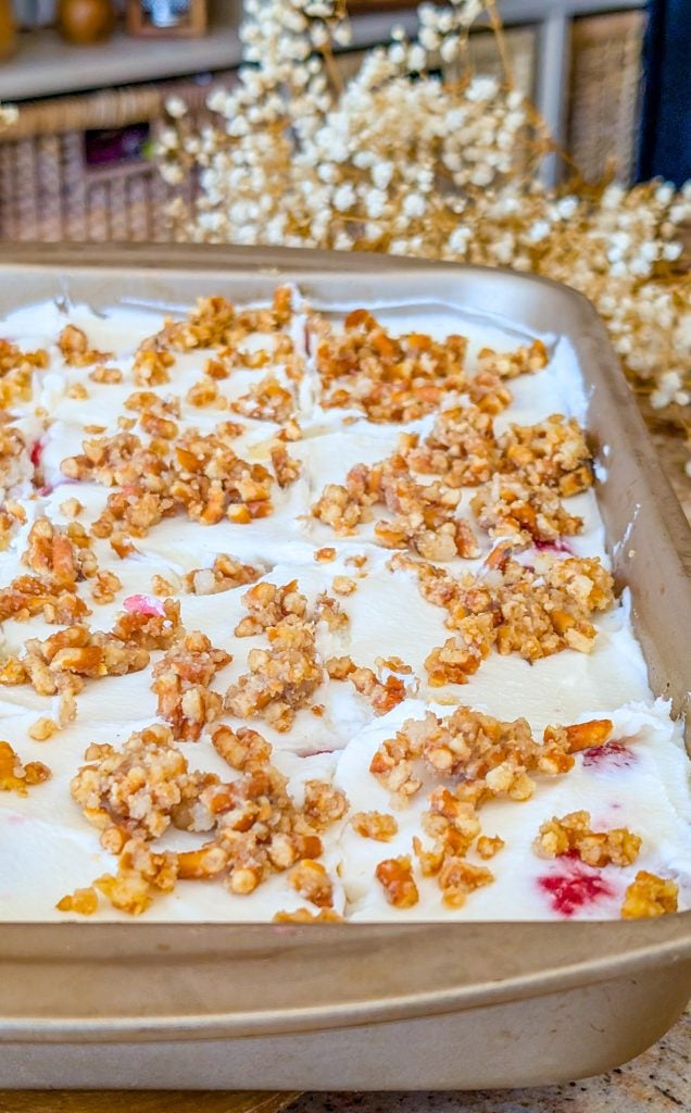 - Preheat the oven to 350°F (175°C). In a medium bowl, combine the crushed pretzels, granulated sugar, and melted butter. Mix until everything is evenly coated. Press the mixture firmly into the bottom of a 9×13-inch baking dish to form a crust.