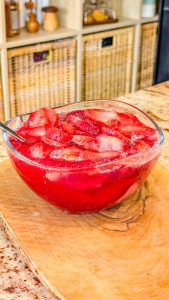- In a separate bowl, dissolve the strawberry gelatin in the boiling water. Stir until completely dissolved. Add the sliced fresh strawberries to the gelatin and mix gently.