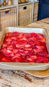- Carefully pour the strawberry-gelatin mixture over the cream cheese layer. Smooth it out gently with a spoon so it’s evenly distributed.