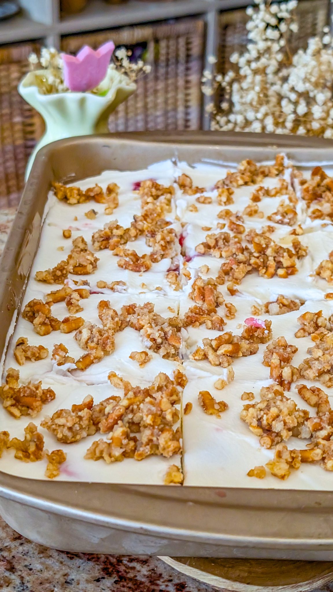 It tastes like childhood memories wrapped in a contemporary, creamy dessert, which is why I adore this recipe. The strawberry crunch topping provides a pleasing contrast of texture and color, and the cheesecake layer is rich and creamy without being unduly sweet. Assemble it the night before and take it out of the refrigerator when guests arrive; it’s also a “make-ahead” dream.
