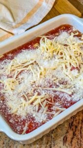 - Remove the cover, sprinkle the mozzarella and Parmesan cheeses evenly over the top, and return to the oven.